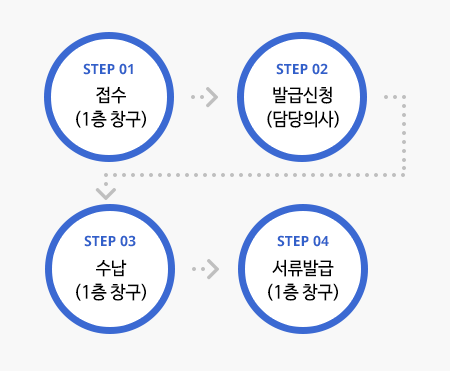 진단서 및 소견서 발급절차![]() 진단서 및 소견서 발급시 준비물 - 병사용 진단서, 연령 감정서는 증명사진 2장 (1부발행시) (2부이상 발급시 : 발행부수 + 증명사진 1장추가) - 모든 증명서 및 진단서 발급시에는 환자 본인의 본원 진찰권과 주민등록증 및 신분증이 필요합니다. - 본인이 아닌 직계가족인 경우 동의서, 가족관계증명서(등본), 환자와 보호자 신분증 그리고 직계가족이 아닐경우 위임장까지 지참하셔야합니다. 진료비 납입증명서 발급절차 - 입원진료를 받으신 경우 : 각 입원 진료에 대한 진료비 납입증명서발급 - 외래진료를 받으신 경우 : 일자별 진료비에 대한 납입증명서 발급 ※ 환자본인이 직접 방문하실 경우 진찰권과 신분증을 지참하여 1층 접수창구 방문(보호자가 방문시 위임장과 신분증, 환자의 진찰권 지참) |