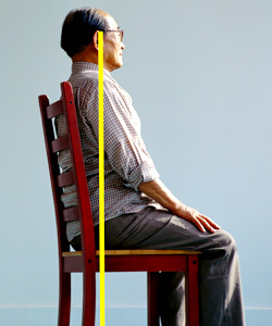 바른 앉는 자세 등받이 있는 의자에 앉으시고 등을 등받이에 기대어 앉으셔야 합니다. 앉은 각도는 100 ~ 110도 정도가 가장 좋습니다. 이렇게 앉았을 때 귀 중심 ~ 어깨 중심선 ~ 허리 중심선은 일자가 됩니다.